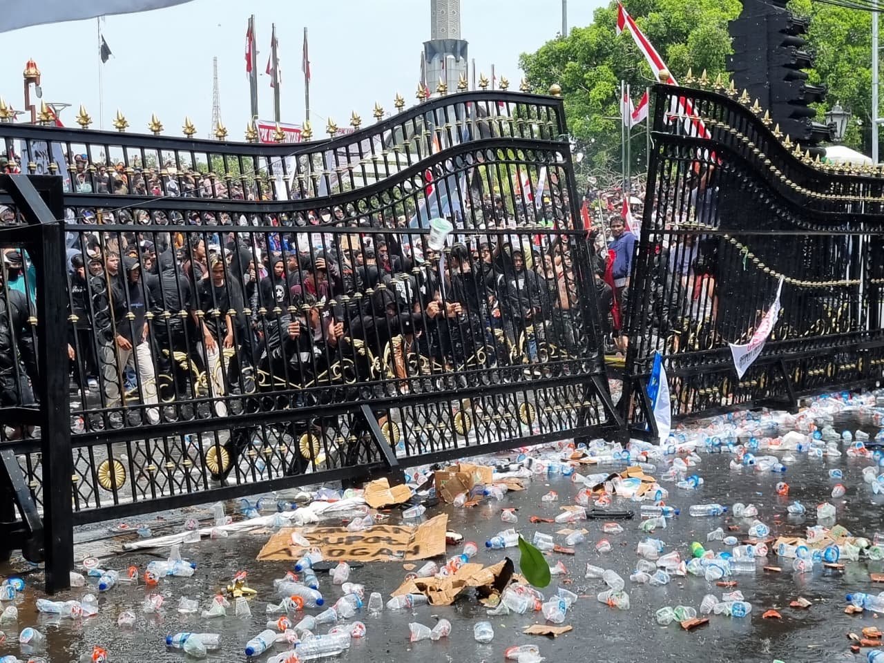 Ketegangan meningkat ketika beberapa peserta aksi melempar botol air mineral ke halaman Kantor Bupati. Peringatan aparat dengan semprotan water canon justru membuat kelompok anarko semakin beringas. Dorongan massa membuat pagar depan kantor nyaris roboh.