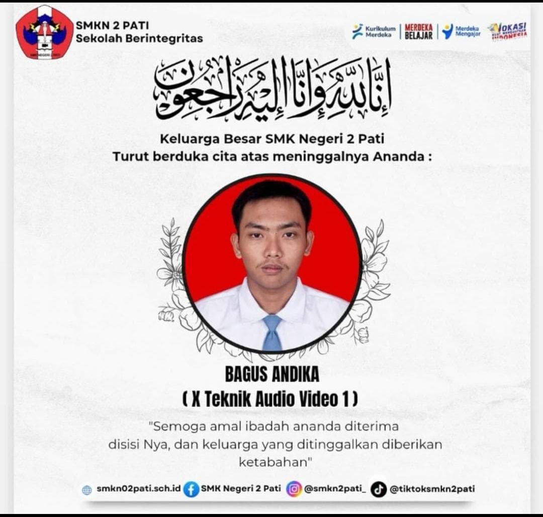 Pati – Korban pengeroyokan pelajar yang terjadi di Desa Muktiharjo pada Jumat 9 Mei 2025 dinyatakan meninggal dunia hari ini Selasa 13 Mei 2025, hal tersebut dilansir dari postingan SMK N 02 Pati.